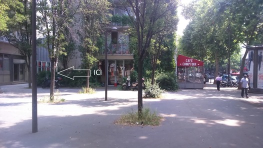→ Contourner le Café Jean par la gauche, nous sommes sur l’arrière, derrière des grilles grises
